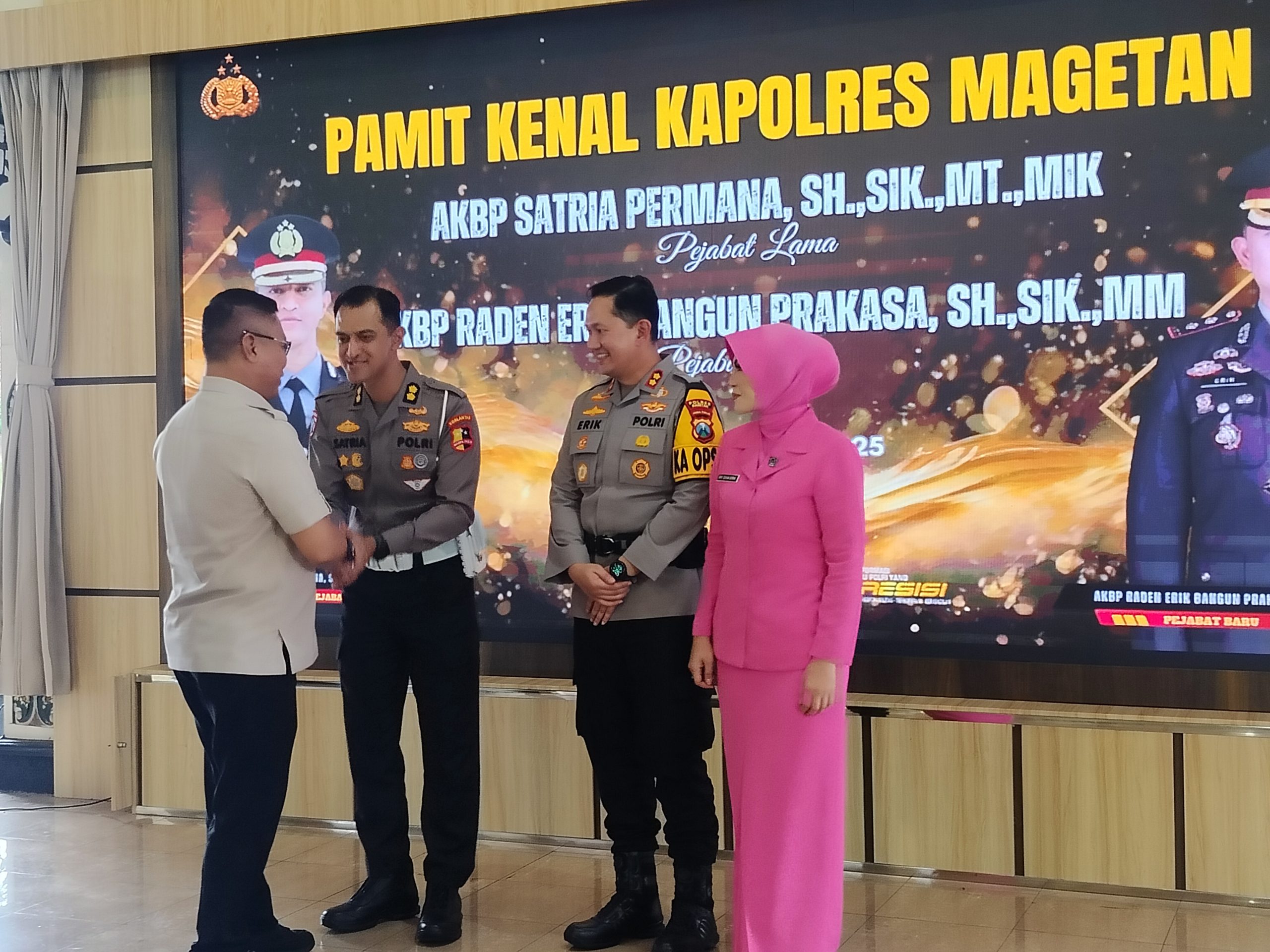 Acara pamit kenal tersebut dihadiri oleh jajaran Forum Komunikasi Pimpinan Daerah (Forkopimda) Magetan, pejabat utama Polres Magetan, serta sejumlah tamu undangan lainnya.