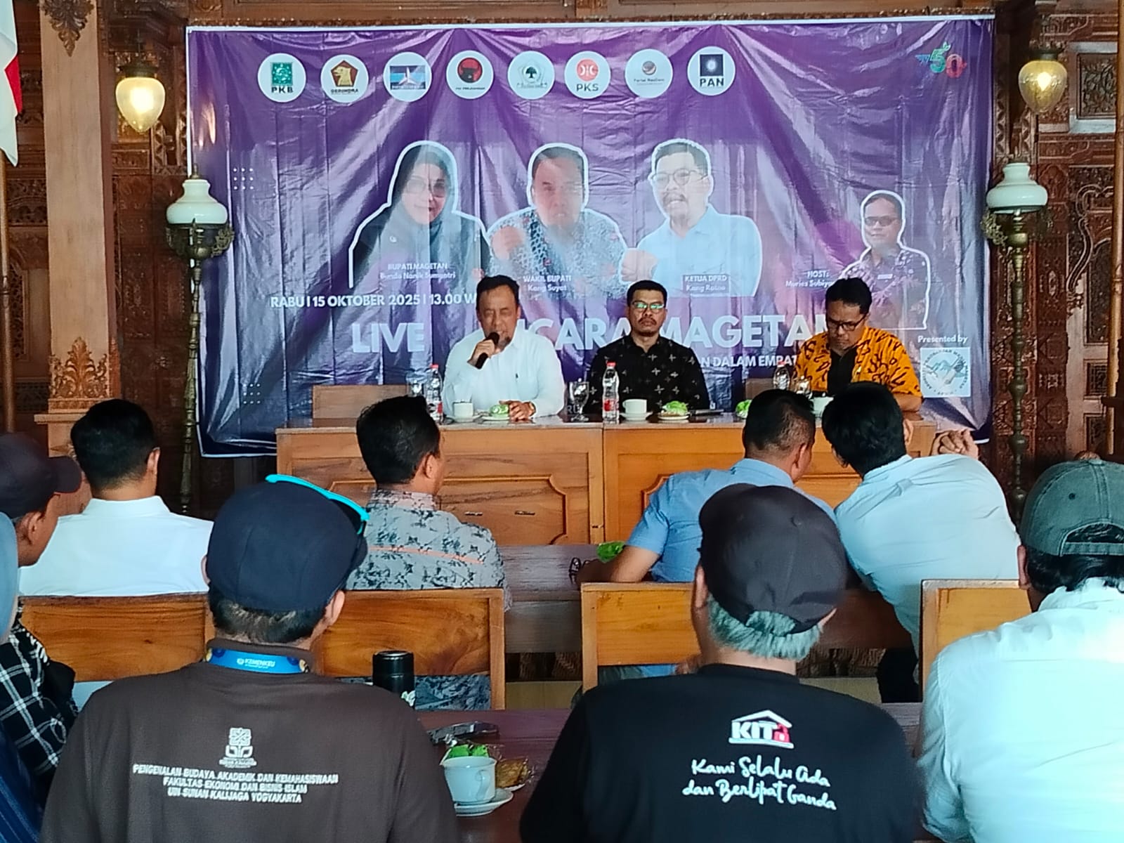 Diskusi yang berlangsung sekitar dua jam ini dipandu oleh Pengamat Politik Logopori Magetan, Muries Subiyantoro, dengan suasana yang hangat dan penuh gagasan kritis. Dua narasumber utama hadir langsung, yakni Wakil Bupati Magetan Kang Suyat dan Ketua DPRD Magetan Kang Ratno.