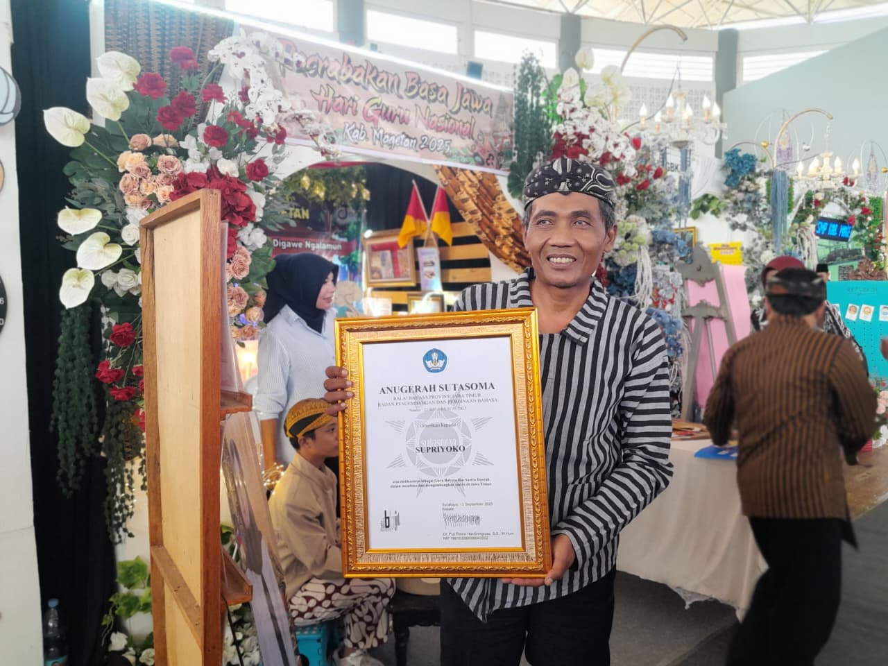 MAGETAN (Lensamagetan.com) – Ketekunan dan cinta terhadap sastra akhirnya berbuah manis bagi Supriyoko, guru Bahasa Jawa di SMP Negeri 1 Parang. Setelah 15 tahun mengabdikan diri melalui tulisan dan pelestarian bahasa daerah, dirinya mendapat penghargaan Anugerah Sutasoma yang diserahkan langsung oleh Wakil Bupati Magetan, Suyatni Priasmoro, dalam rangkaian peringatan Hari Guru Nasional di GOR Ki Mageti, Selasa (4/11/2025).