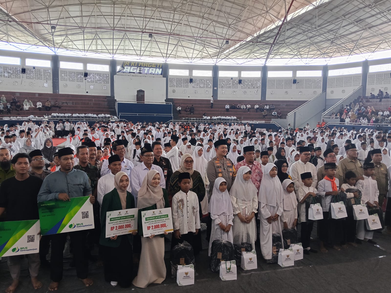 MAGETAN (Lensamagetan.com) – Badan Amil Zakat Nasional (Baznas) Provinsi Jawa Timur bersama Baznas Kabupaten Magetan menggelar Safari Ramadhan 1447 Hijriah bertajuk “Zakat Menguatkan Indonesia” di GOR Ki Mageti, Kabupaten Magetan, Kamis (5/3/2026). Kegiatan tersebut diisi dengan penyerahan santunan kepada seribu anak yatim dari berbagai kecamatan di Magetan.