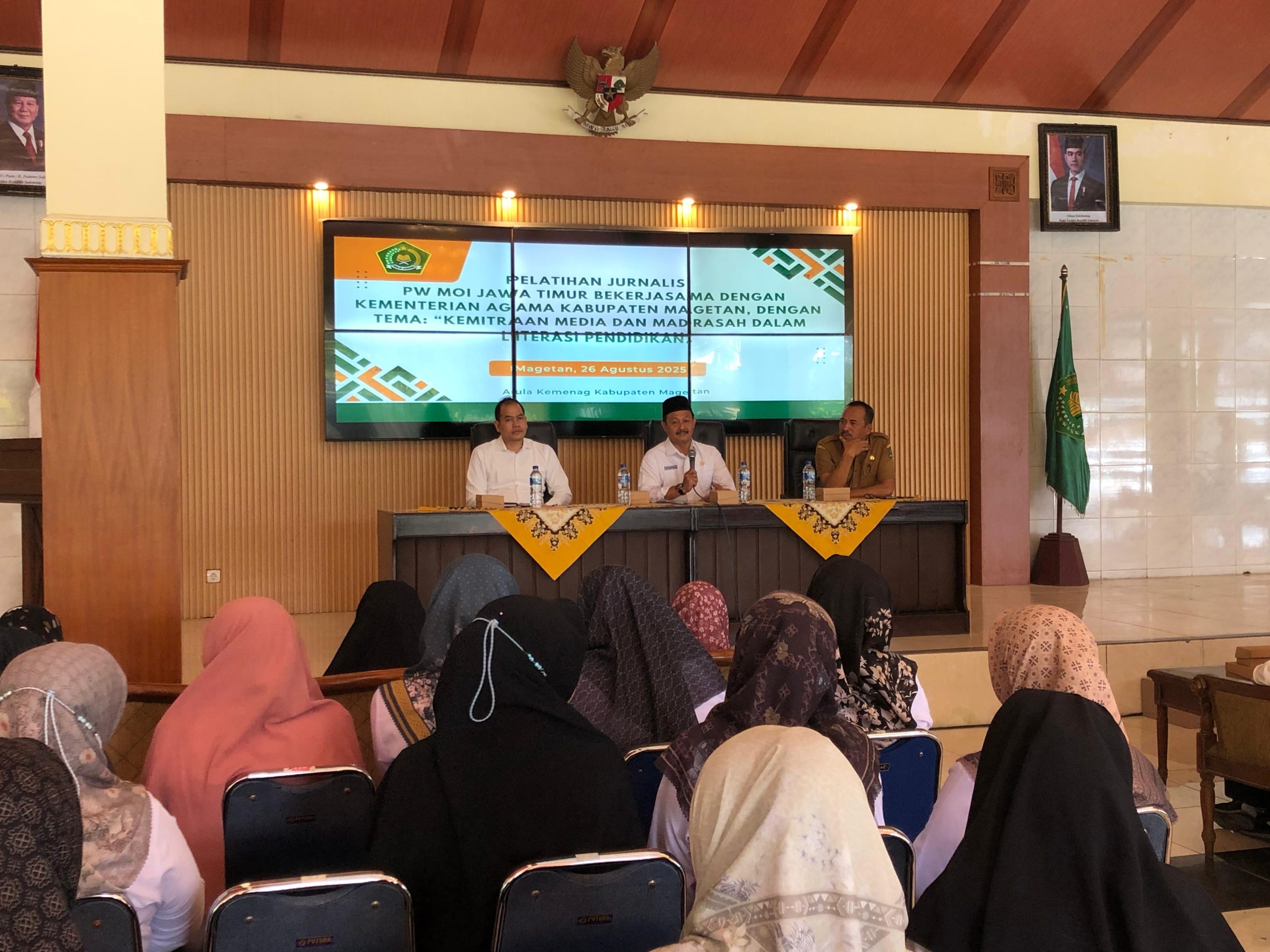 MAGETAN (Lensamagetan.com) – Persatuan Wartawan Media Online Indonesia (PW MOI) Jawa Timur bekerja sama dengan Kementerian Agama (Kemenag) Kabupaten Magetan menggelar Pelatihan Jurnalistik bertema “Kemitraan Media dan Madrasah dalam Literasi Pendidikan”, Selasa (26/8/2025).