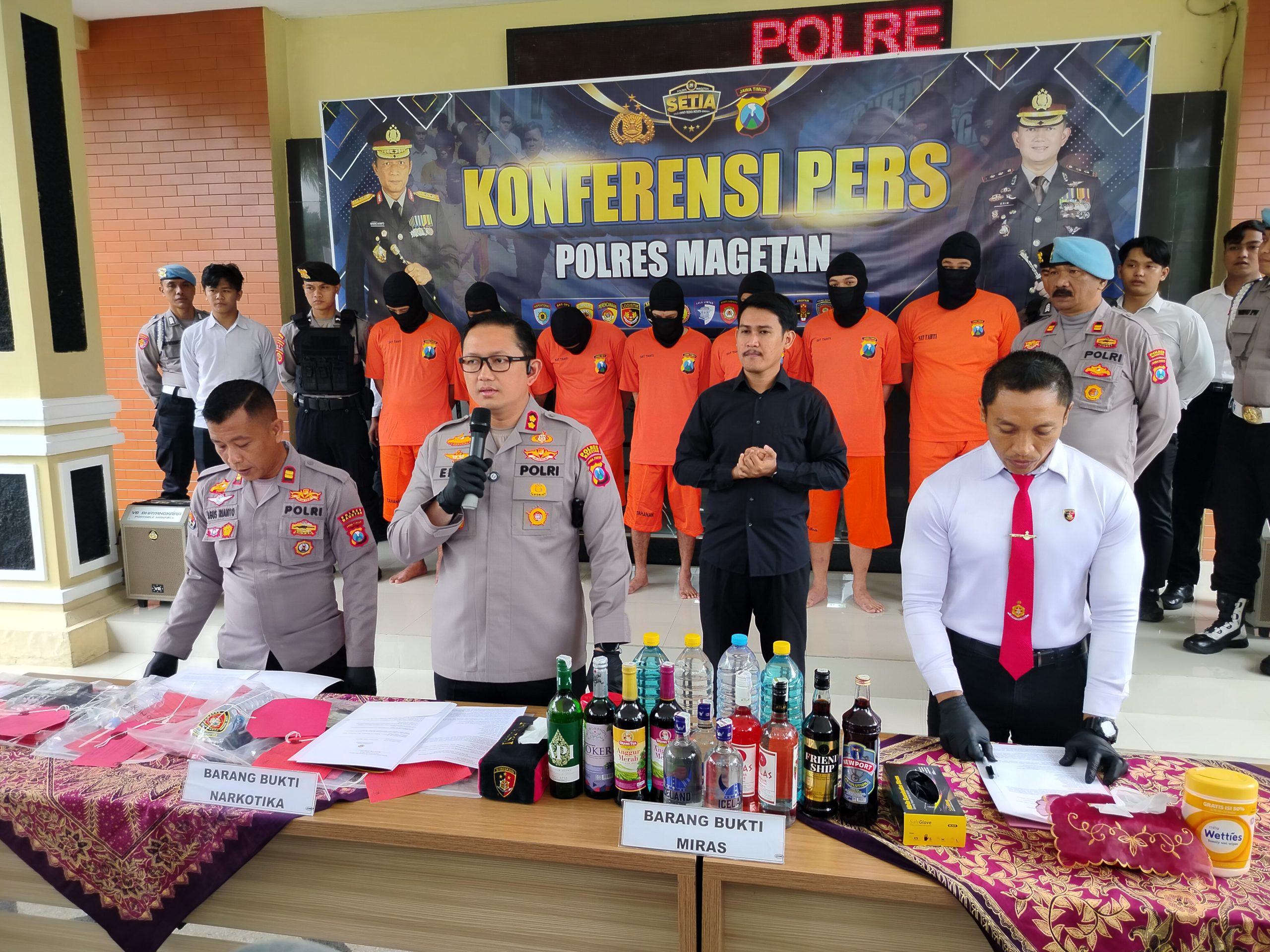 Untuk tersangka antara lain WES, AAS, D, HWP, RBI, JAS, SDP, AYE, AT, MRN, dan AP. Mereka ditangkap di beberapa wilayah berbeda di Kabupaten Magetan, seperti Kecamatan Maospati, Takeran, Plaosan, dan Magetan Kota.